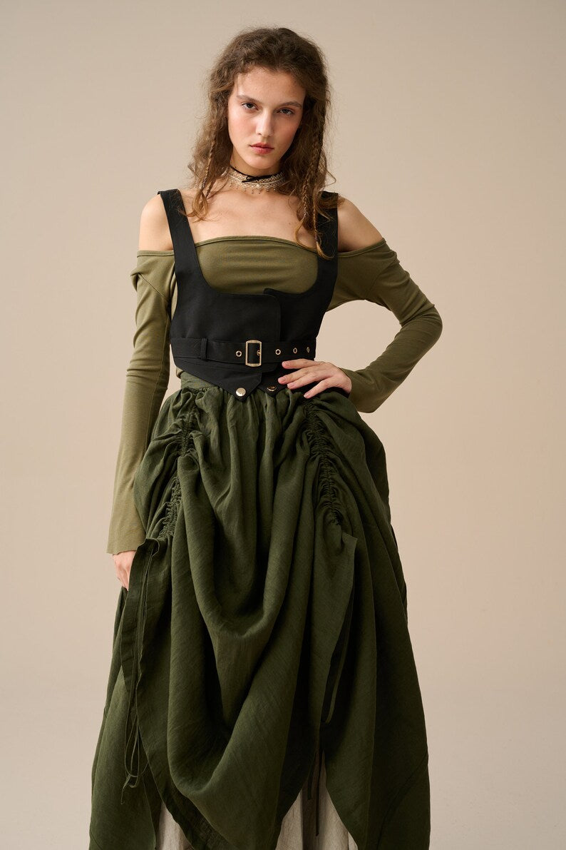 • The forest green skirt, wide and flowy with practical side pockets, inspired by the medieval and Victorian eras where sophistication met freedom of expression.